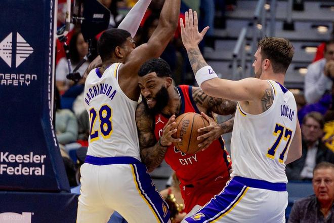 中场休息过后,第三节开局两队展开内线博弈,各得4分后,斯马特接东契奇传球完成空接得分,里夫斯随即命中三分,将分差扩大至14分。鹈鹕仍执着于冲击内线追分,八村垒则用三分、斯马特用中投回应,即便墨菲突破上篮将分差缩小至11分,湖人还是迅速开启“一波流”模式——东契奇串联、艾顿护框反击,球队多点开花打出11-0攻势,比分来到88-66。此后湖人始终掌控节奏,维持92-70的领先优势,期间阿尔瓦拉多与范德比尔特各命中一记三分,克内克特与东契奇因争议动作各吃一次技术犯规,鹈鹕罚中两球并完成暴扣追分,但湖人仍以30-25净胜5分,前三节战罢以95-77领先18分。